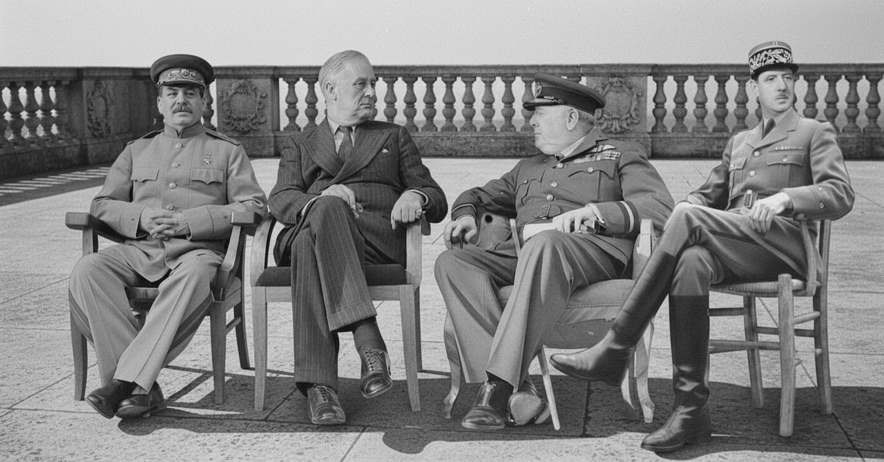Je trouve que la posture de De Gaulle est fabuleuse, et tellement dans la superbe de son personnage, alors que c'est la pièce rapportée et composite. Les 3 autres sont extraits de la photo célèbre de Téhéran, mais De Gaulle est une création de l'IA, couplée a une tête prélevée sur un autre document historique et ajustee sur le corps généré par l'IA, parce que le visage de De Gaulle IA, quoi que plausible, n'était pas suffisamment fidèle.