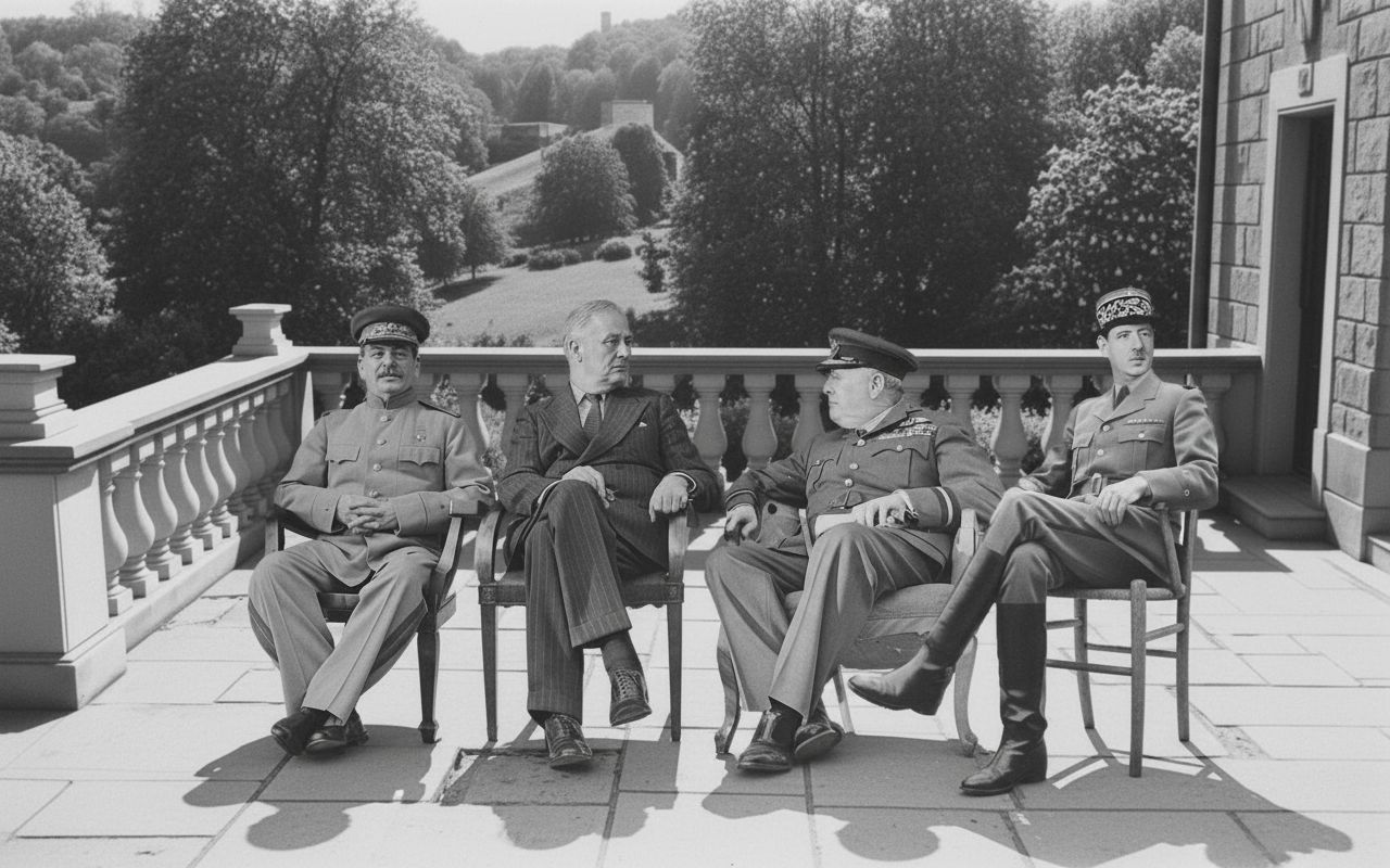 Oui, la disparité des sièges m'a beaucoup préoccupé. Au contraire de Casablanca, ou les 4 protagonistes étaient assis sur des fauteuils identiques (et superbes, au demeurant, Art Déco et tout et tout), à Téhéran, les Trois Grands étaient assis sur 3 sièges différents, et donc Churchill dans un fauteuil probablement plus confortable, mais plus bas que les deux autres, ce qui n'était pas très diplomatique. Comme je reprenais les effigies des trois à l'identique, il était difficile d'harmoniser les fauteuils. Ceux de Staline et Roosevelt étaient suffisamment similaires, mais celui de Churchill le forçait à adopter cette posture en contrebas de Roosevelt, que l'IA aurait probablement du mal à rectifier.