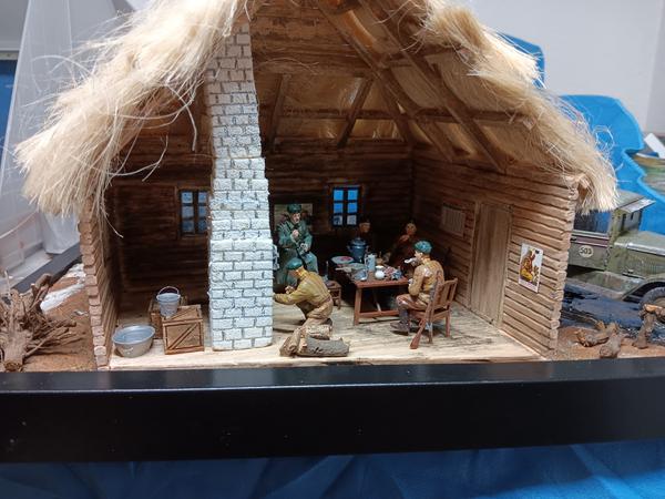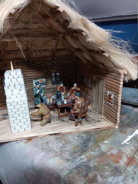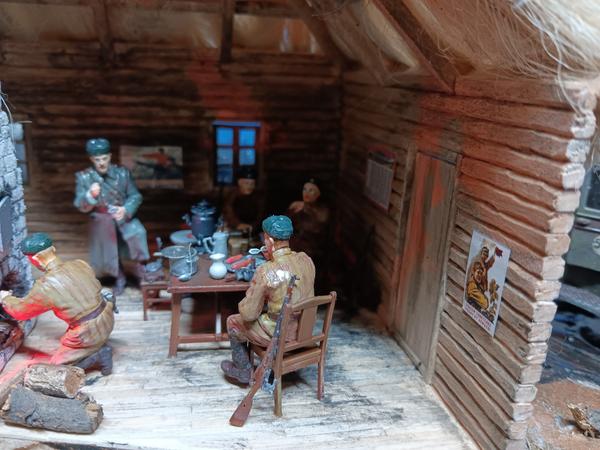 Garée devant celle-ci, un camion Zil 5, qui monte au front avec quelques fantassins avant un probable retour avec du matériel ou des blessés. Dedans, le jeune du groupe s'ingénie à entretenir le feu de la cheminée, tandis que l'officier discours cuillère en main, face à un sniper occupé à sa gamelle. Derrière, deux fantassins se resservent un verre. La table est encombrée de matériels et nourriture diverses : samovar, vase à vin, assiette, une marmite où l'on devine du gouslash, pain, fromages et quelques saucisses à cuire. Derrière la cheminée, quelques caisses, ainsi qu'une bassine et un seau pour ce que l'on devine être une ébauche d'hygiène personnelle. La cabane est depuis longtemps vidée de civils : au murs, pendent diverses affiches ainsi que le calendrier 1942. Evidemment, les frontovikis ont tout salis en rentrant ... Le secteur est calme, on n'a pas peur de faire du peu. C'est la paix, enfin un peu de paix dans la guerre.