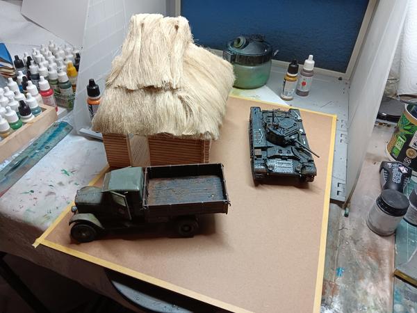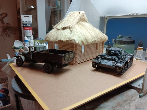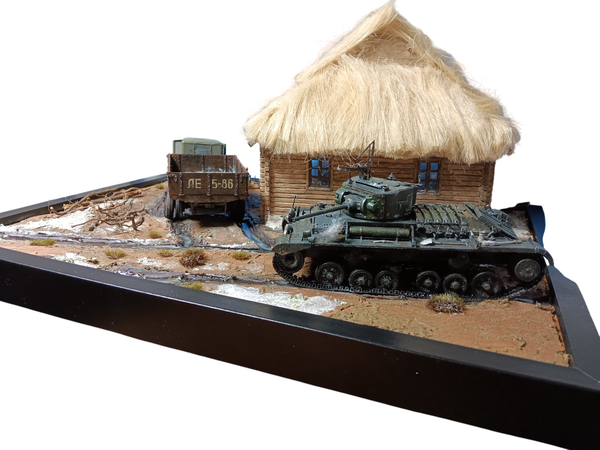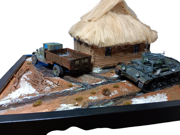 Diorama "Guerre & paix", 1/35. Un coin assez minable du front Nord, mars 1942, en plein Rasputitsa. La neige font sur les routes boueuses de la Baltique, faisant gicler la terre autour d'un Valentine Mk IV passant à pleine vitesse devant une Isba abandonnée dont les bosquets alentours ont été largement dégagés pour faire du bois de chauffage. C'est la guerre.