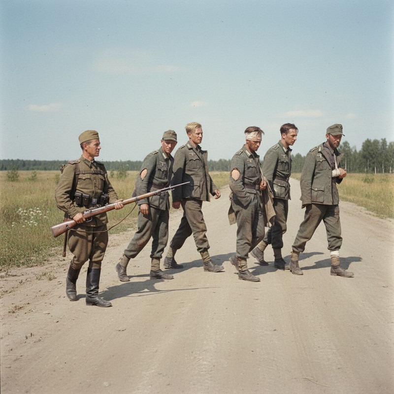 | Citation: | | Create a photorealistic photo from the painted picture of German POWs (Prisoners of War), 1944, being led by their Soviet guard. The scene is on a dusty road in Central Russia in hot summer weather. Ensure that the details of the uniforms remain intact. They must look like real men in an archive photo. You are free to interpret their likeness to make them look as real and plausible as possible. Captured on Kodachrome film, with an authentic tone and colour palette. |