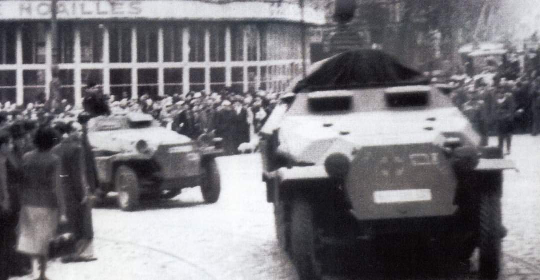 Mais le coin a beaucoup changé. En effet le bâtiment en gris avec cinq fenêtres par étage (en fait en briques marrons) existe toujours mais la rue est actuellement sur sa gauche tandis que ceux que l'on voit sur la première photo, dans l'axe de la colonne avec le même SdKfz et son équipage de joyeux drilles ont disparu.