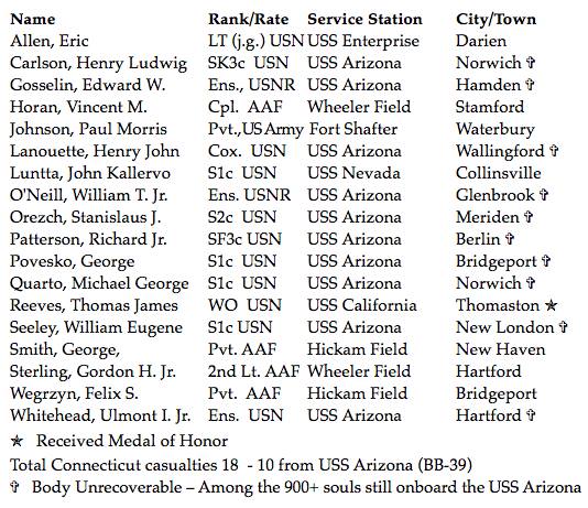 Il faut savoir que le Connecticut a payé un prix important en vies humaines le 7 décembre 1941 puisque 18 soldats, aviateurs et marins originaires de notre état sont tombés au champ d’honneur ce jour-là,10 d’entre-eux étaient à bord de l’USS Arizona et reposent encore aujourd’hui au fond de la rade parmi leurs camarades sur ce qui est maintenant un mémorial, de plus l’un de ces 18 soldats a reçu la Medal of Honor à titre posthume (dont voici un lien avec le nom de ces héros : https://cdn20.patch.com/inline_images/307603/1480887351.jpg) .