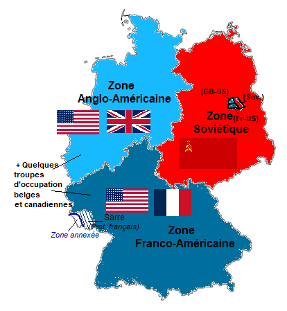 De plus, la France ayant continué le combat, ce ne sont plus 3 alliés, mais 4 qui se partagerons l'Allemagne. Il faut se rappeler que Staline n'a consenti à une occupation française qu'à la seule condition que la zone française soit prise sur les espaces anglais et américains.