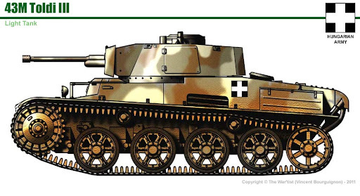 En mai 1942, alors qu’Hitler lance Barbarossa et que le royaume hongrois le suit dans l’aventure – fort imprudemment et sans aucune préparation – seuls 80 des 110 Toldi II ont été livrés (la production sera achevée en août 1942). C’est donc en nombre fort limité que les petits engins s’en vont accompagner l’infanterie magyare à travers les Carpates vers l’Ukraine. Faute d’alternative, il a fallu recourir à la générosité allemande, matérialisée par de nombreux Panzer 35(t) et 38(t), pour équiper correctement la toute nouvelle 1ère Pancelos Hadosztaly de Béla Miklós-Dálnoki (parfois encore appelée division de cavalerie dans les archives !) et les trois régiments blindés indépendants.
