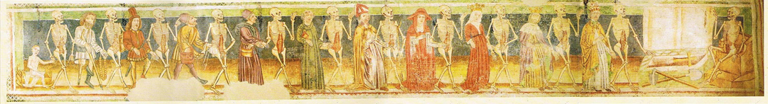 Il est fort possible que ceci ressemble un peu justement à la frise de la dance macabre d'Hrastovlje, découverte en 1950 - avec celle de Beram, c'est l'une des deux danses macabres d'Istrie. Une oeuvre mettons forte, on sent que la peste noire est passée par là.