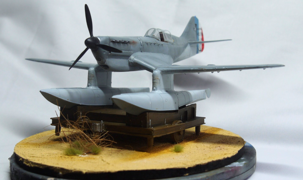 La maquette Senifer est une rareté (plus produite, je crois), un pur bloc de résine massif - et ca se sent rien qu'au poids. C'est aussi un petit bijou d'artisanat, avec une gravure très fine et des assemblages 'pas si déconnants' nécessitant il est vrai quelques poncages et affinages de pièces (à réaliser sous masques ...) avant peinture. Globalement, je n'ai que des compliments sur cette maquette, fort simple - moins de 40 pièces compris chariot - mais qui présente un bon niveau de détail y compris sur le cockpit. Pas sur le train ... forcément. Côté décalcomanie, c'est la simplicité : drapeaux de dérives, inscription, numéro de série (le N°001, forcément ...) et enfin cocardes d'ailes. Le camouflage est composé de deux tons de gris typiques des avions de la MN de cette période, s'agissant d'un prototype sorti d'usine je suis parti sur une séparation nette entre les couleurs. L'ensemble a ensuite fait l'objet d'une patine très légère (blanc sur les plus gros panneaux, afin de gonfler le volume) puis d'un jus gris foncé. Pas beaucoup d'autres choses - quelques éléments métalliques en limite de toles et les échappements dessinés au feutre. Ah oui ! Le chariot a été traité à l'huile, au pigment et au métal liquide avant positionnement sur un support maison (pigment vallejo sur support sable ...) avec quelques brins d'herbes maison ou Vallejo en prime.