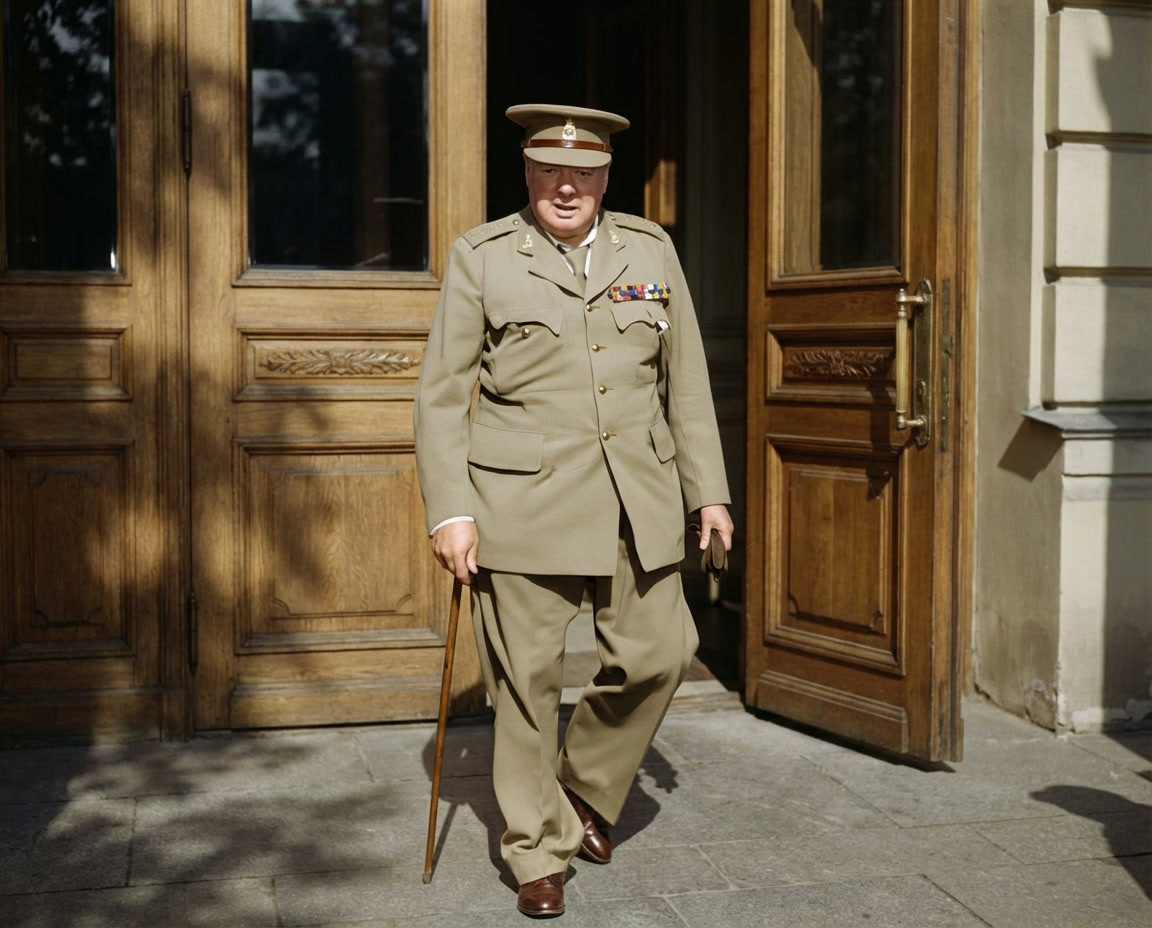 Je me suis posé la question, et j'ai pensé que WSC avait posé pour un portrait dos à la porte, et venait de se mettre en mouvement.